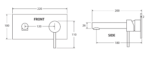 SIZE = outlet – 200mm end to end or 180mm to centre of outlet + backing plate 220mm wide x 100mm high