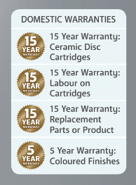 Warranty = 15 years, ceramic disc cartridges + labour and 5 years, coloured finish