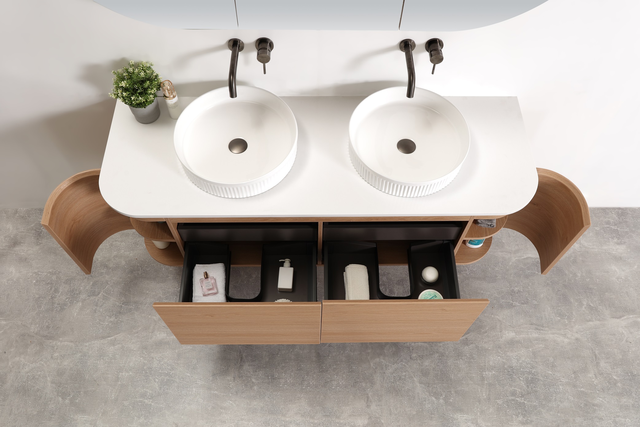Slender Curved Vanity with Drawer and Side Doors