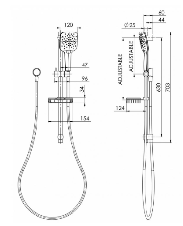 - 630mm brass rail with adjustable shower height